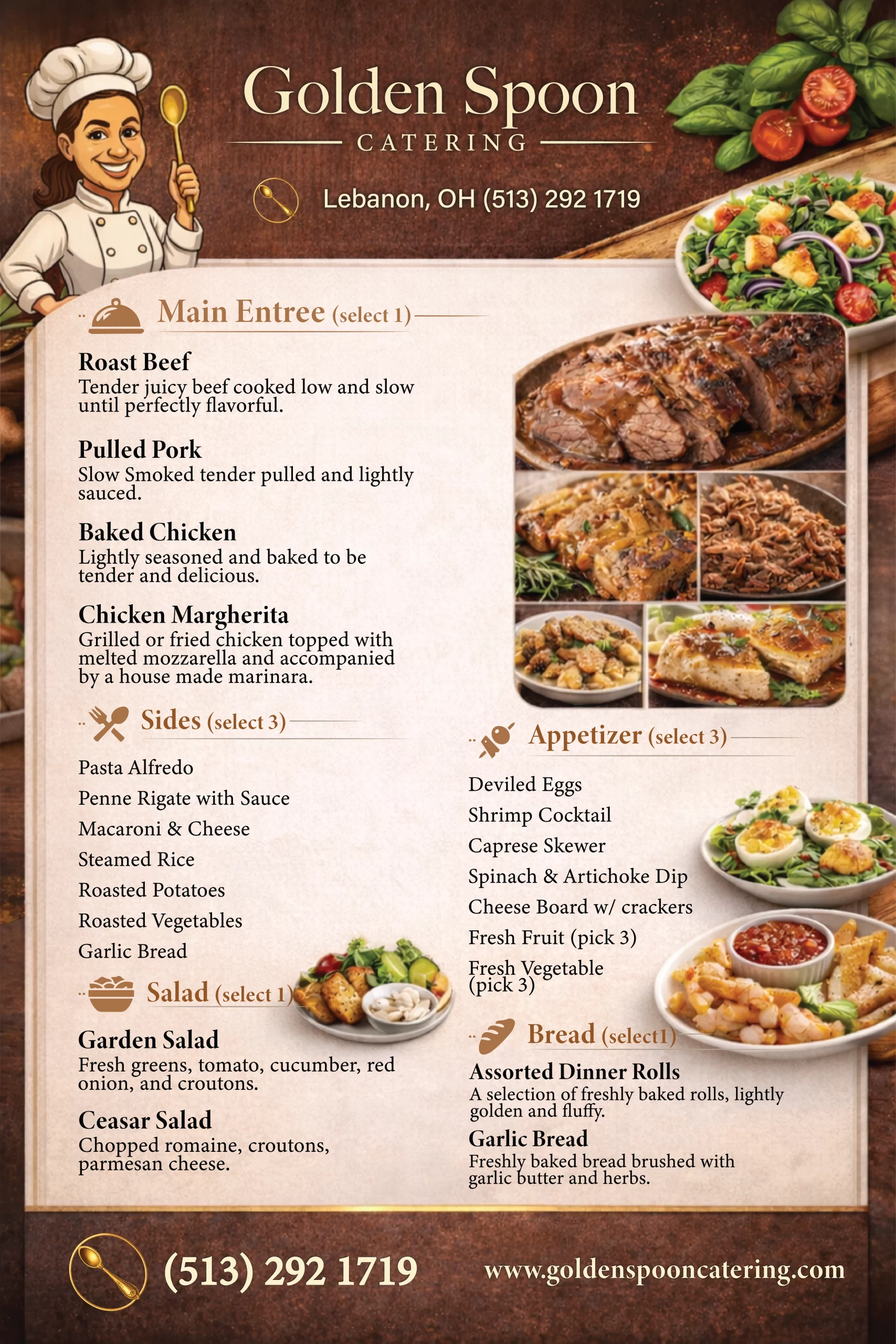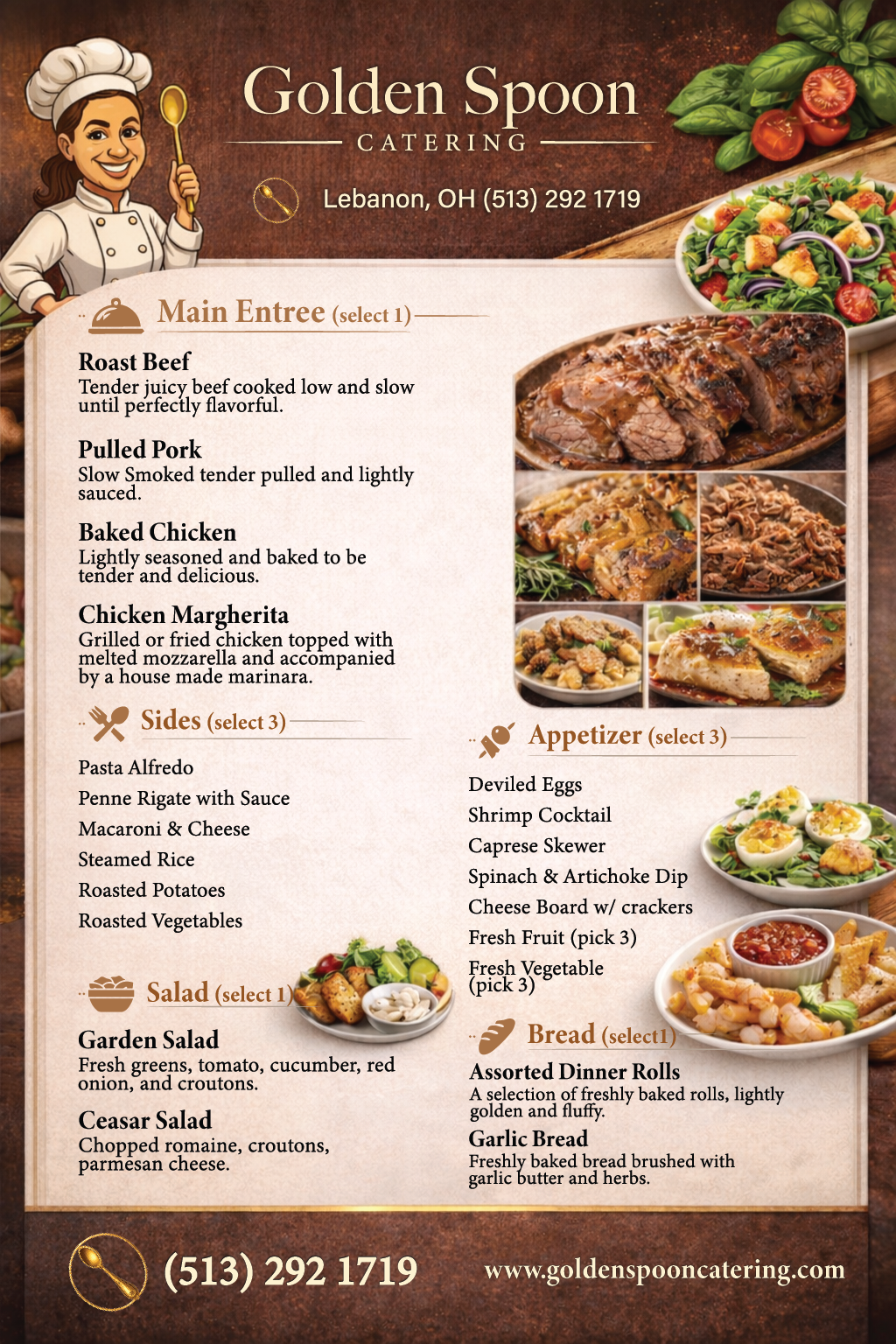 At Golden Spoon Catering, we believe great food brings people together. As a family-run catering business serving Lebanon, OH, our focus is simple: fresh ingredients, made-from-scratch dishes, and reliable service you can count on.